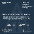 У ніч на 21 травня (із 00.30 21 травня) противник атакував 76-ма ударними БпЛА типу Shahed і безпілотниками-імітаторами різних типів із напрямків: Курськ, Орел, Брянськ – рф.