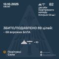 У ніч на 13 жовтня (з 20:00 12 жовтня) противник атакував 82 ударними БпЛА типу Shahed, Гербера і безпілотниками інших типів із напрямків: Орел, Курськ, Приморсько-Ахтарськ – рф, близько 50 із них – ударні БпЛА.