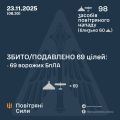 У ніч на 23 листопада (з 19:00 22 листопада) противник атакував 98-ма ударними БпЛА типу Shahed, Гербера і безпілотниками інших типів із напрямків: Орел, Курськ, Міллєрово, Приморсько-Ахтарськ – рф та Чауда — ТОТ АР Крим, близько 60 із них – «шахеди».