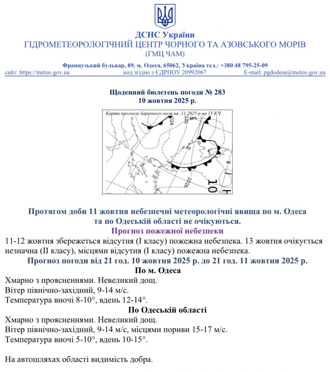 ОДЕСА, 10 ЖОВТНЯ 2025 РОКУ, КОНТЕКСТ-ПРИЧОРНОМОР’Я — Прогноз погоди по Одесі та Одеській області на 11 — 14 жовтня від Гідрометцентру Чорного та Азовського морів.